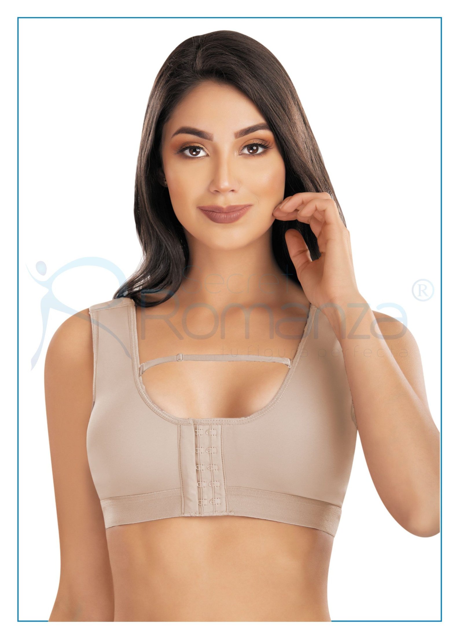 Sosten postquirurgico con tirantes anchos ajustables en 2 posiciones. Lycra prehormada en copa para proteger las zonas mas delicadas en el postoperatorio. Con corrector de postura, suave, ligero y de tacto frio. Dispone de 2 lineas de ganchos para una puesta comoda y para regular la compresion. El sujetador postquirurgico incluye tirante horizontal para el ajuste de la copas en su separación.